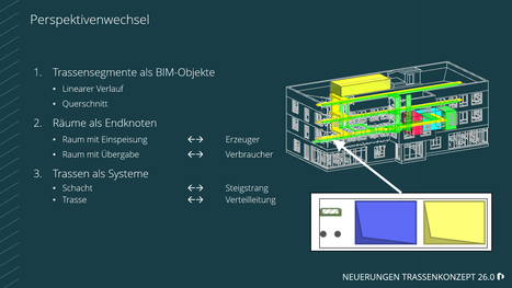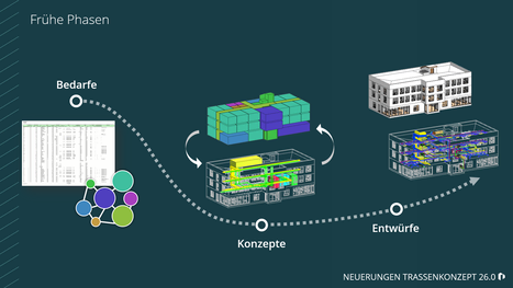 Grupiranjem više prostorija u zone opskrbe sa sabirnim tačkama, moguće je posebno efikasno dimenzionisati glavne trase. Energetski zahtjevi automatski se prikupljaju i dimenzioniše segment po segment kroz konstruisanje trase i pripadajuće sisteme u početnim i završnim komponentama. Dimenzije zatim možete direktno primijeniti u postojećem konceptu trasa, od definisanja presjeka do automatskog generisanja pred-dimenzionisanih vodova u modelu.